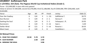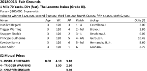 The winner aside, for an ungraded race with a relatively small purse, this year’s edition of the California Derby drew a surprisingly competitive field. Though far from the top Derby hopeful in trainer Bob Baffert’s barn, Once On Whiskey is a useful sort, and his second place finish at 9/2 odds was more than enough to keep him on the Derby trail (his next start will be in the Robert B. Lewis Stakes at Santa Anita on February 3).