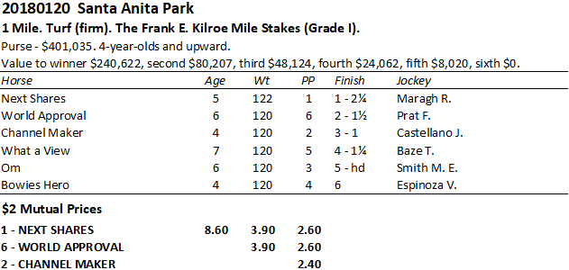 —Mar 10— Next Shares followed his decisive 2018 debut victory in the Grade 3 Thunder Road Stakes with another easy win, chasing down World Approval at the halfway mark and drawing out to win the Grade I Frank E. Kilroe Mile by two-and-a-quarter lengths.